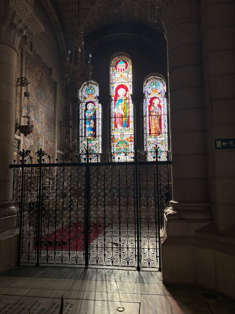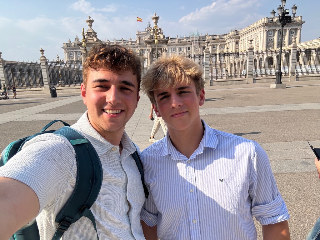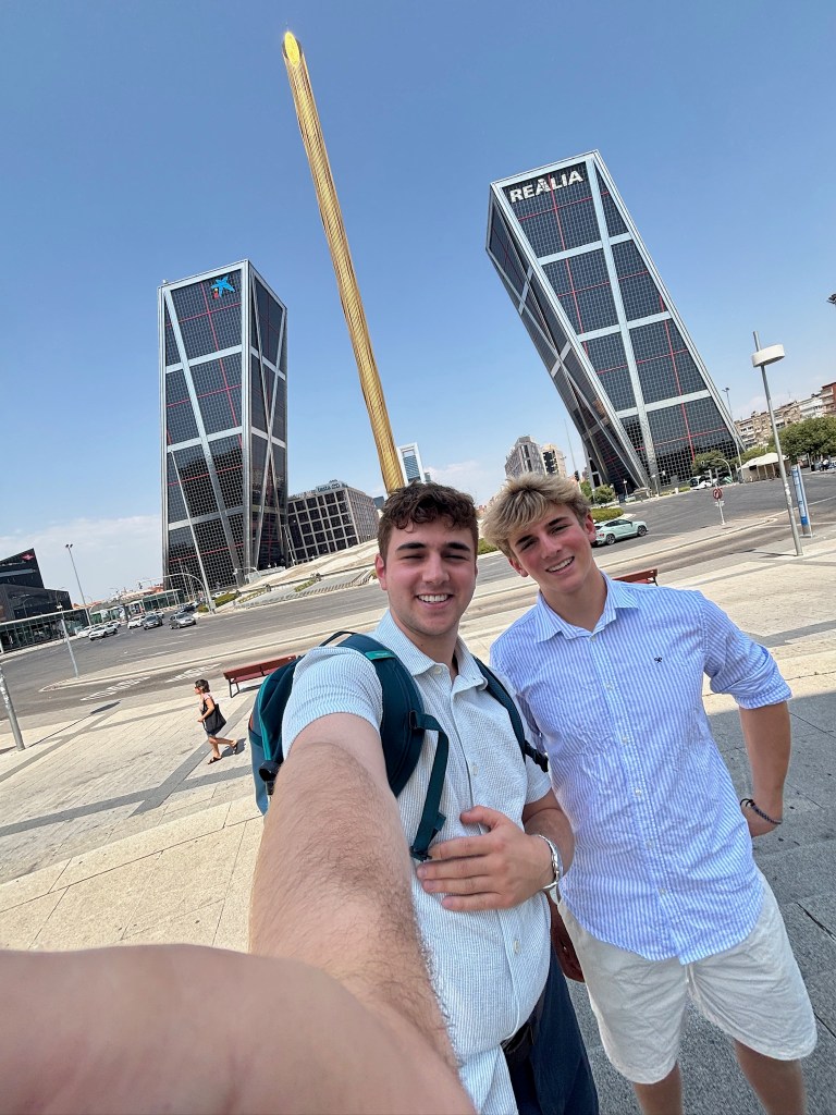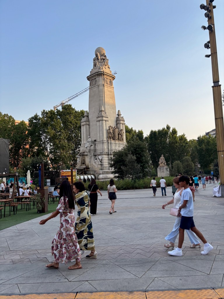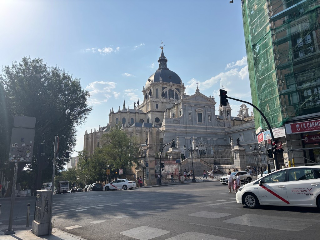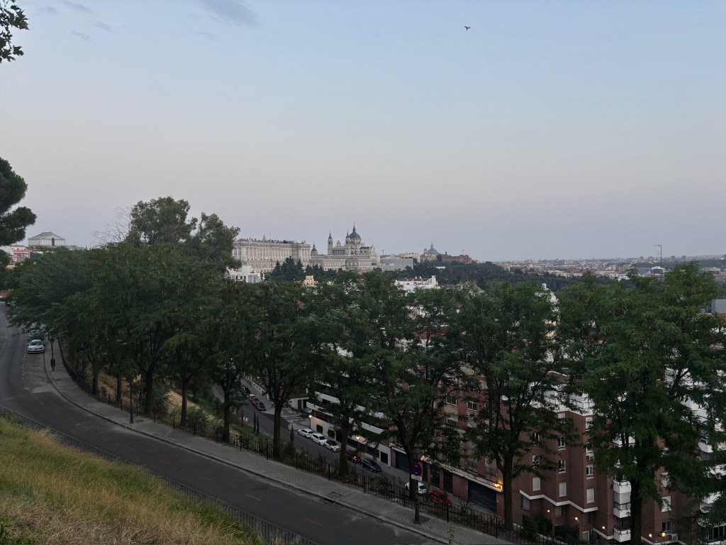 On Saturday, we tried out a second gym, this one a little bit bigger, but still small by our American standards. We took the metro up to Plaza Castilla to see the leaning office towers and had a really nice breakfast at a cafe. After that, we took the metro to the center and walked through Malasaña, visiting some vintage stores along the way. We ended up at Mercado San Miguel, a large indoor food market with many stalls and different offerings and enjoyed burrata tapas, some empanadas, and bao buns. We then walked towards the Palacio Real (Royal Palace). We walked through the large cathedral near the palace (Catedral de Santa María la Real de la Almudena) and went into the expansive crypt below. We walked around the next door Royal Palace, and decided that it was far too big for any one family to live in. We made an emergency water break at the Starbucks tucked into the Royal Theater building (it’s been over 100° walking around!). After our revival, we walked through the Gran Via and ended up in Plaza de España. From there we walked around Temple Debod where we saw the sunset. It got a little cloudy just before the sun set so we didn’t have a great view, but there were a lot of people out which was fun to see.