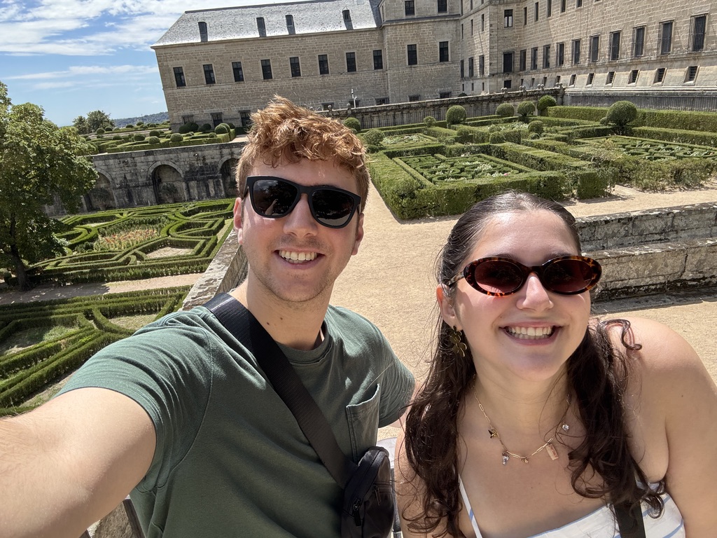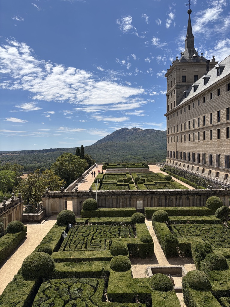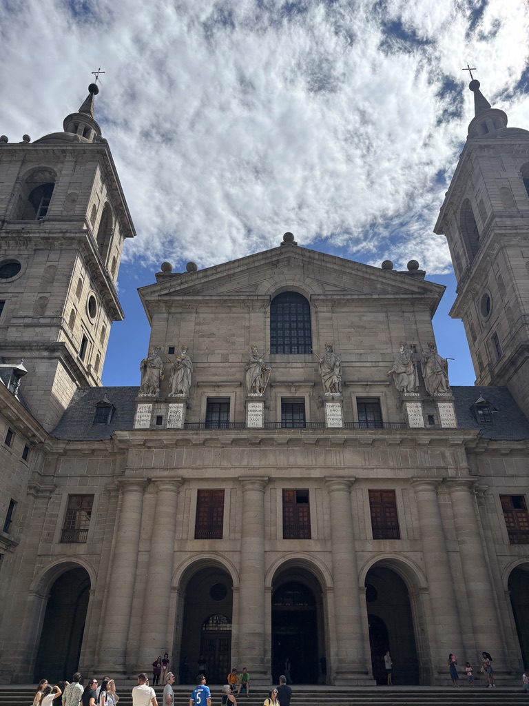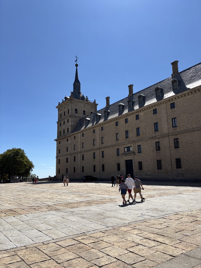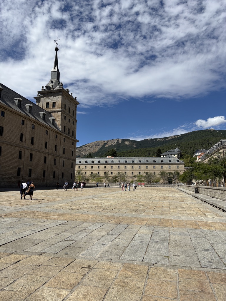 Yesterday (Saturday), I took a day trip from Madrid to a town called El Escorial (~ 30 miles from the city). I traveled with Paula, one of the other just-out-of-college teachers. We’re the only two new teachers on our campus, and among 3 brand new/just out of college teachers, so we’ve been hanging out a lot! We met at the bus station on the west side of the city, about a 20-minute walk for me. The ~ 50-minute ride is included in the youth metro card, so we didn’t have to pay anything else for the ride there or back (I love public transportation). Arriving in the small town, we wandered in the streets and got a small snack before hitting the main attraction, the monastery/basilica/palace. It’s a massive structure that sits slightly apart from the small town, and we could see the skyscrapers of Madrid in the distance. The town is surrounded on three sides by mountains and is itself quite hilly.
