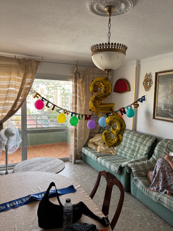 On Sunday (birthday!), we had a slower morning. Paula decorated for me, which was really sweet! Then we had some breakfast and spent much of the afternoon on the beach. It was a perfect beach day, and the water was quite warm! We headed back to the city center for a sunset Catamaran ride. Before getting on, we walked up the pier a bit and saw the largest rigged sailboat in the world (5 masts!). Our (much smaller) boat was pretty full, but we got there a little early to secure a prime spot up front on the nets between the pontoons. We met our new best friend, a businesswoman named Pilar from Valencia (see photo). We chatted about all of her business ventures, her son, and pretty much everything else! After the boat ride, we walked to the restaurant for dinner, which was delicious! We finished the night off with a slice of cake in the apartment and some TV (I fell asleep on the couch).