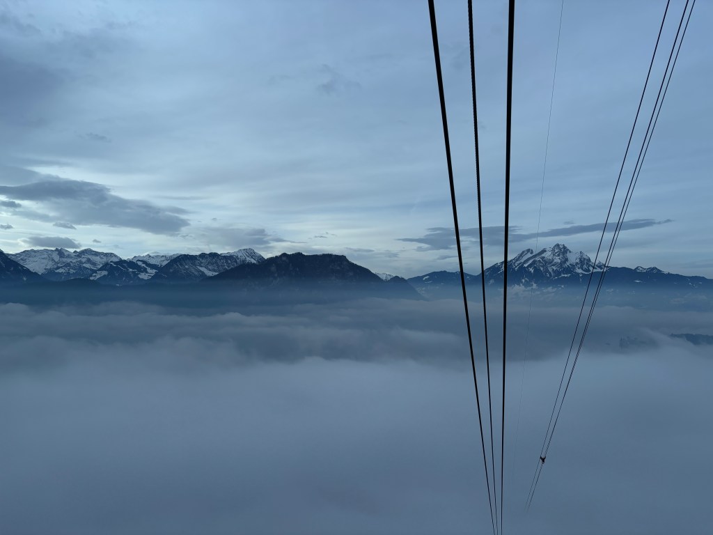The next morning, I woke up to overcast skies and headed down for a great breakfast spread at the hotel. I was a little disappointed that I couldn’t see the mountains as clearly as I wanted to, but it was still a gorgeous morning. I walked up through the town of Weggis to the aerial tram station and boarded the next gondola up to the first stop on Mount Rigi. After just a minute or two in the gondola, we entered deep cloud cover and maybe a minute later, pushed through above the clouds and had the most amazing view of the mountains surrounding the lake. It was so worth the cloudy morning, wow! At the top, I hopped off the gondola and went to the spa, which conveniently had its entrance in the tram station.