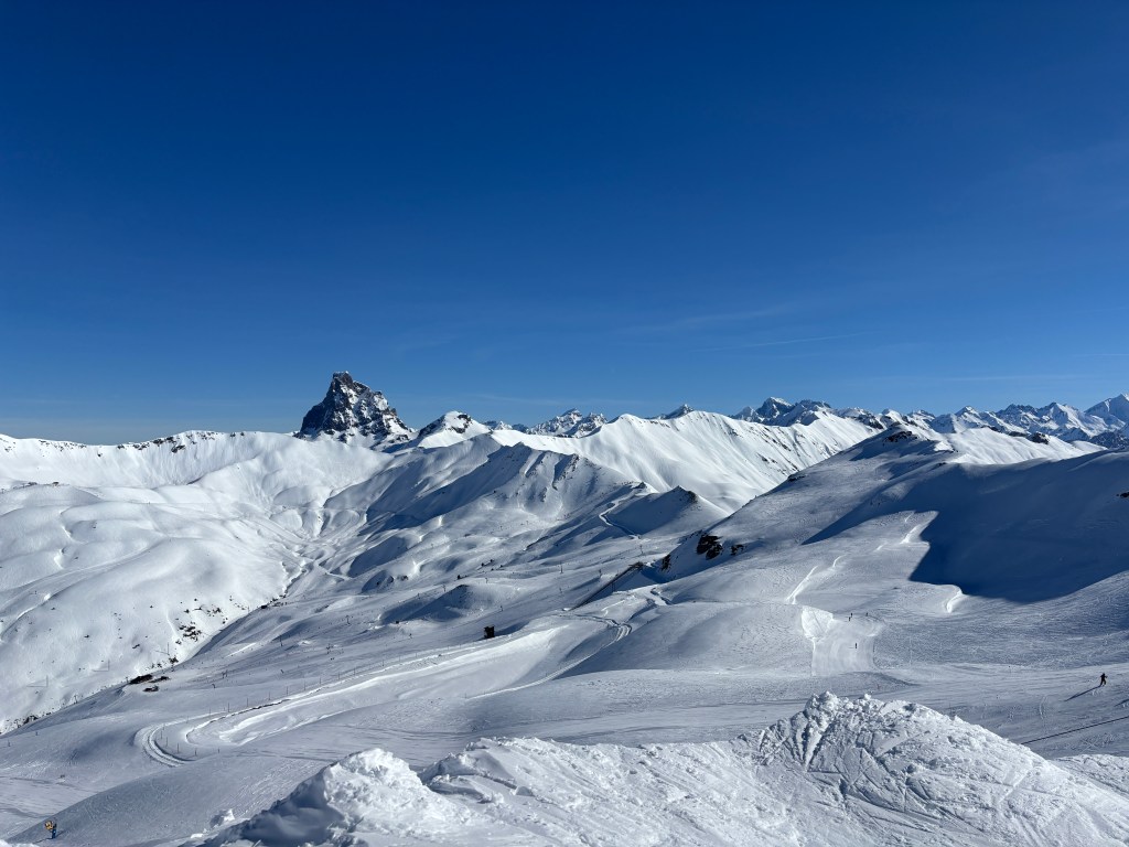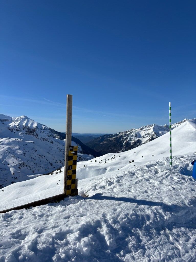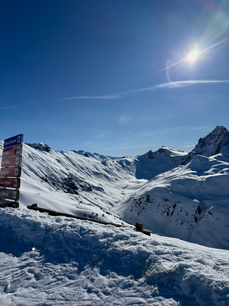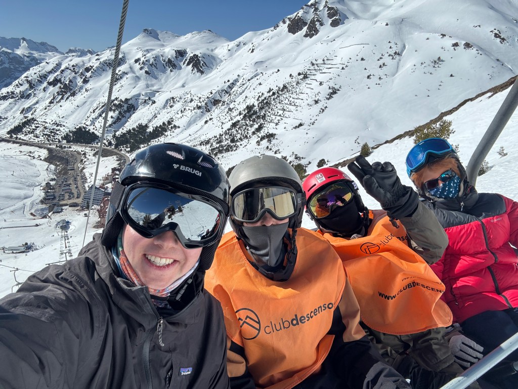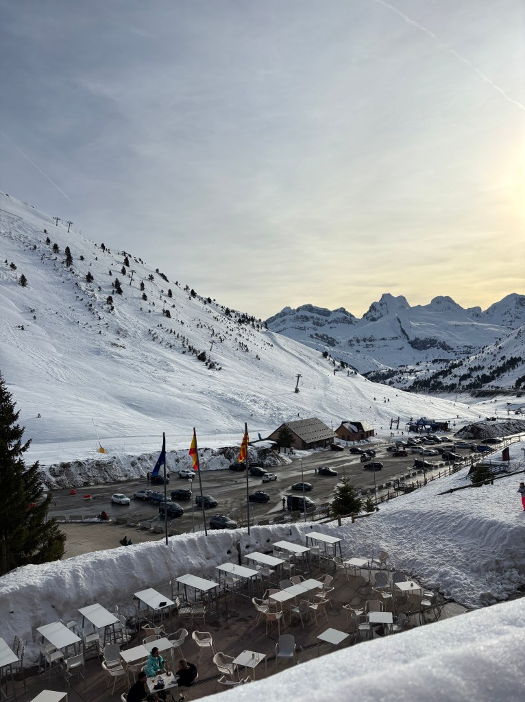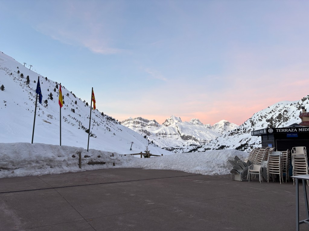 The snow was generally crunchy in the morning and slightly icy in parts (nothing like the northeast ice slabs, though). But the 50°F sunny days quickly melted off the crunch into powdery and sometimes a little slushy terrain by the late afternoon. The landscape around the resort was by far the winner for me on the trip. We had amazing views at the top and bottom of the mountain of the Pyrenees, including the ridge dividing France and Spain. At the top of one lift, we were less than 100 feet from the border!